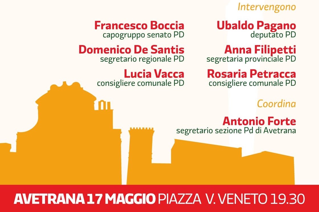 Il 17 maggio, alle ore 19.30, in piazza Vittorio Veneto in Avetrana avrà luogo un pubblico comizio. Interverranno l’on. Francesco Boccia (capogruppo al Senato del Pd); l’on. Ubaldo Pagano (deputato del PD); Domenico De Santis (segretario regionale Pd); Anna Filippetti (segretaria provinciale PD); Lucia Vacca (consigliera comunale Pd Avetrana); Rosaria Petracca (consigliera comunale Pd Avetrana).
