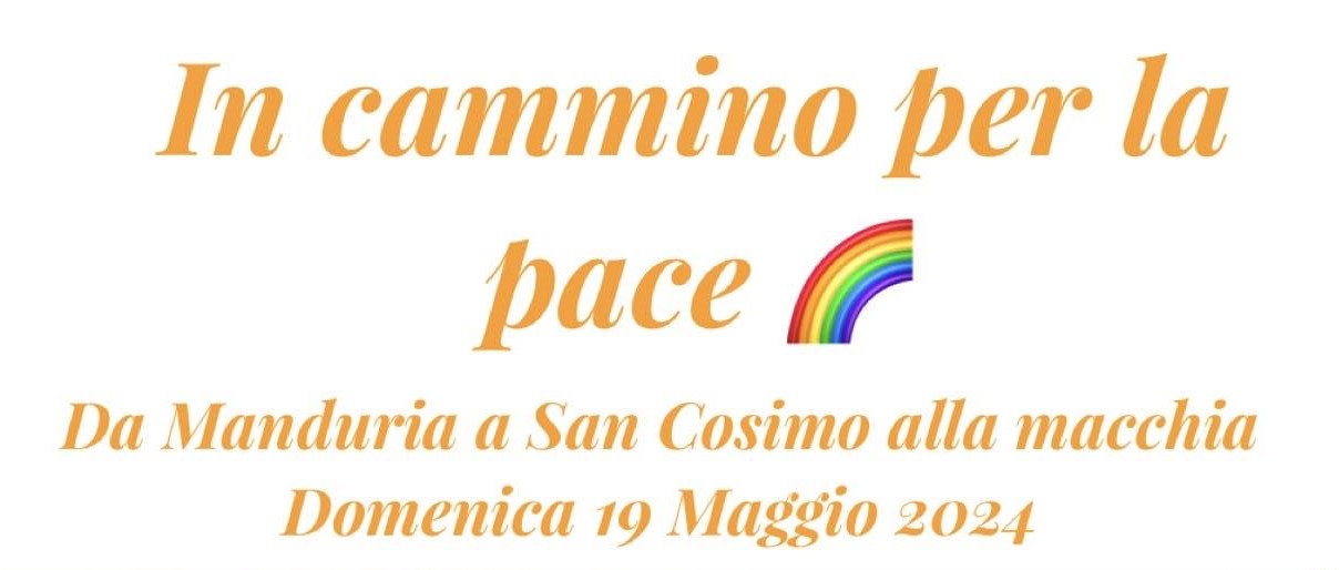 Un cammino di pace e per la pace alla nostra maniera, sereno, silenzioso sotto un’unica bandiera quella arcobaleno da Manduria al santuario di San Cosimo alla macchia per promuovere un messaggio di solidarietà e di speranza» è riportato in una nota di Messapia Trek. «Il nostro cammino partirà dal largo Federazione a Manduria (nei pressi dei Produttori Vini) alla volta del santuario di San Cosimo alla Macchia, percorrendo le vecchie strade e i vecchi tratturi di una volta per una distanza di 9 km.