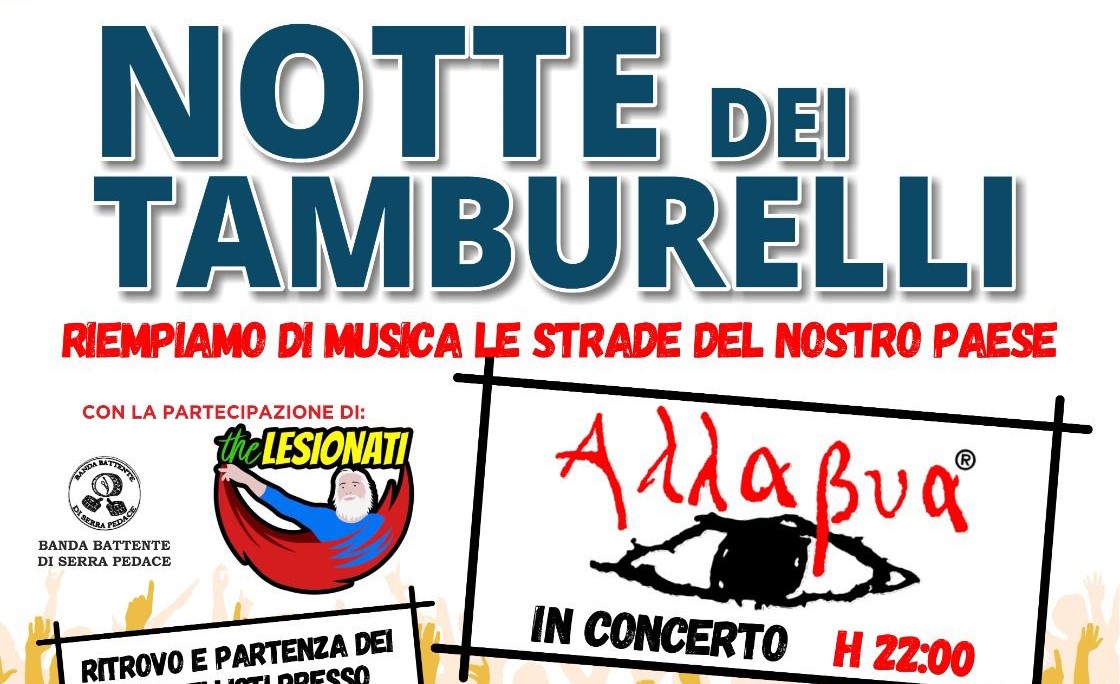 Il 1° giugno, a Monteroni di Lecce, torna per la seconda edizione, la “Notte dei Tamburelli”, un evento da non perdere: centinaia di tamburellisti provenienti anche da fuori regione, una ronda travolgente, la Banda musicale di Monteroni, i tamburi battenti di Serra Pedace, il grande concerto finale degli Alla Bua e ancora tante specialità tipiche salentine da gustare in allegria in compagnia dello spettacolo dei “The Lesionati”.