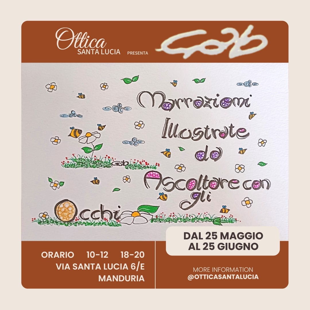 Dal 25 maggio al 25 giugno sarà visitabile la mostra “Narrazioni illustrate da ascoltare con gli occhi” dell’artista brindisina Gabriella Croce in arte Gab. Sarà allestita presso l’ottica Santa Lucia in via Santa Lucia 6/e in via Santa Lucia 6/E. La cittadinanza è invitata all’inaugurazione che si terrà sabato 25 maggio alle ore 17.30 per conoscere Gab e ascoltare con gli occhi la bellezza delle sue illustrazioni da silent book che hanno ad oggetto la natura, gli animali e le stagioni.
