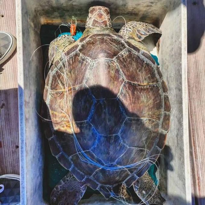 Il suo carapace e i suoi arti erano avvolti da un groviglio di lenze di un palangaro