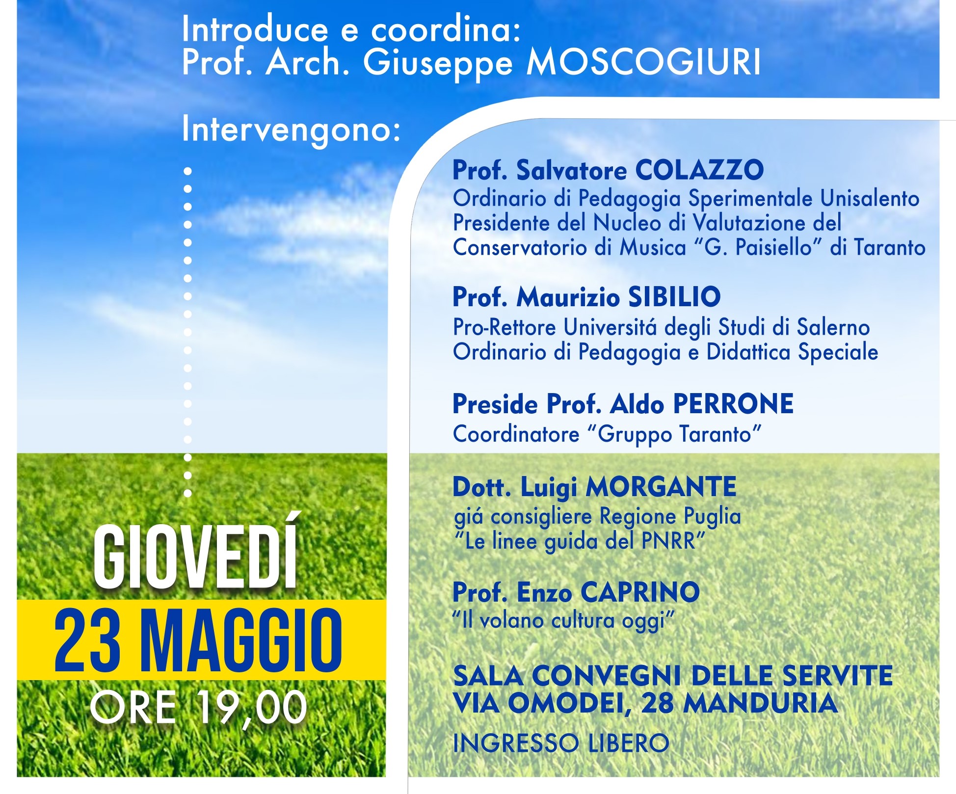 Intervengono Salvatore Colazzo, ordinario di Pedagogia Sperimentale presso Unisalento e presidente del Nucleo di Valutazione del conservatorio di musica “Paisiello” di Taranto; Maurizio Sibilio, pro rettore dell’Università degli Studi di Salerno e ordinario di Pedagogia e Didattica Speciale; Aldo Perrone, coordinatore “Gruppo Taranto”; Luigi Morgante, che relazione sul tema “Le linee guida del PNRR”; Enzo Caprino, che relazione sul tema “Il volano cultura oggi”.