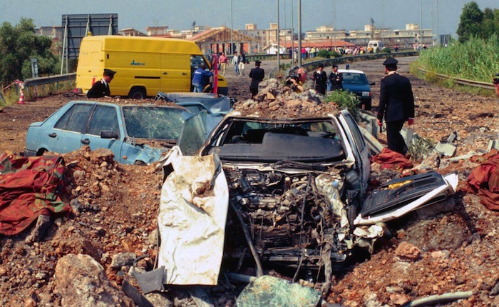«Alle ore 17.58 del 23 maggio 1992, una carica di cinque quintali di tritolo posizionata nei pressi dello svincolo di Capaci-Isola delle Femmine viene azionata da Giovanni Brusca, il sicario incaricato da Totò Riina per uccidere il giudice Giovanni Falcone.