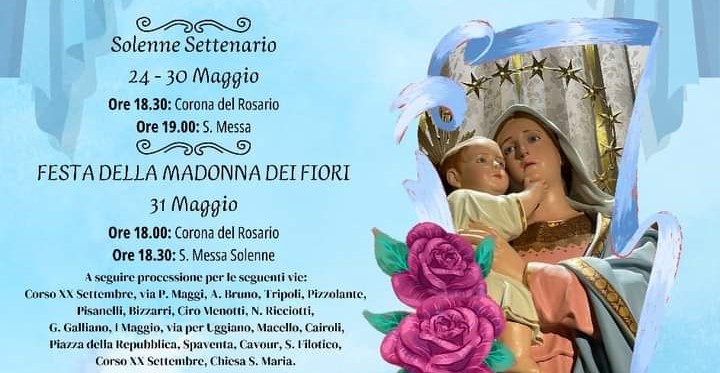 «Carissimi fedeli e parrocchiani, ci prepariamo a celebrare la Madre del Signore, che ci onoriamo di venerare con il titolo di “Madonna dei Fiori”, con un solenne Settenario e una gioiosa processione per le strade del nostro territorio parrocchiale» scrive il parroco don Teodoro Tripaldi nel manifesto. «Guarderemo a Maria come nostra sorella e Madre e le chiederemo che, con la sua preghiera e il suo esempio,ci aiuti a crescere nella comunione con Dio e i fratelli».