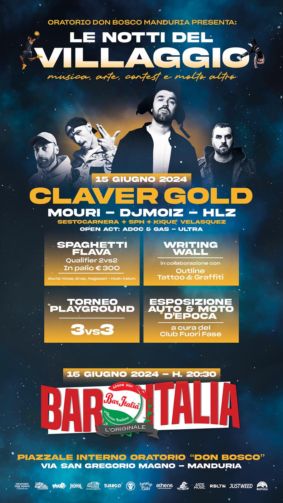 Il 15 giugno “Claver Gold” con Mouri, Dj Moiz e Hlz, preceduti nel pomeriggio dal contest “spaghetti flava”, “writing Wall”, “torneo playground” e “esposizione di auto e moto d’epoca”.