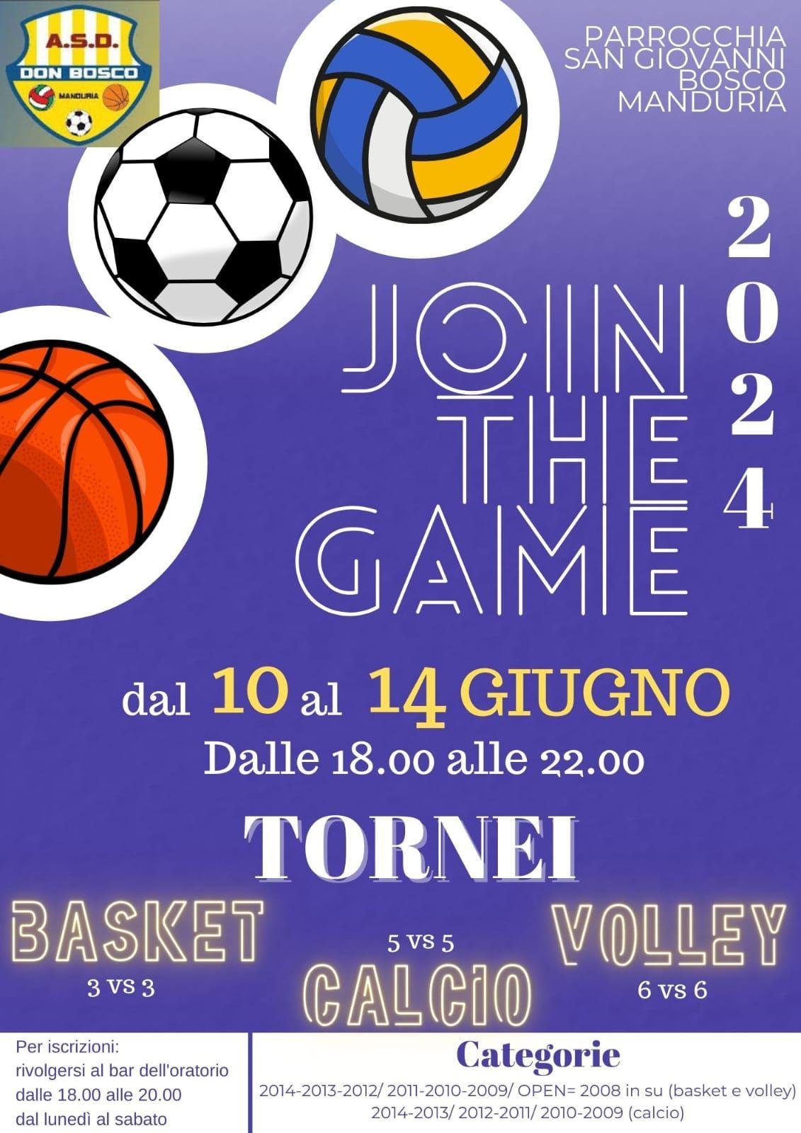 L’oratorio “San Giovanni Bosco” di Manduria propone un’estate oratoriana 2024 ricca di eventi da non perdere. Si parte il 10 giugno con “Join the game”: cinque serate dedicate allo sport con tornei di calcio, basket e pallavolo, per poi passare al tanto atteso “Gioca Estate” dal 17 giugno al 6 luglio per i tutti i ragazzi dalla I elementare alla III media.