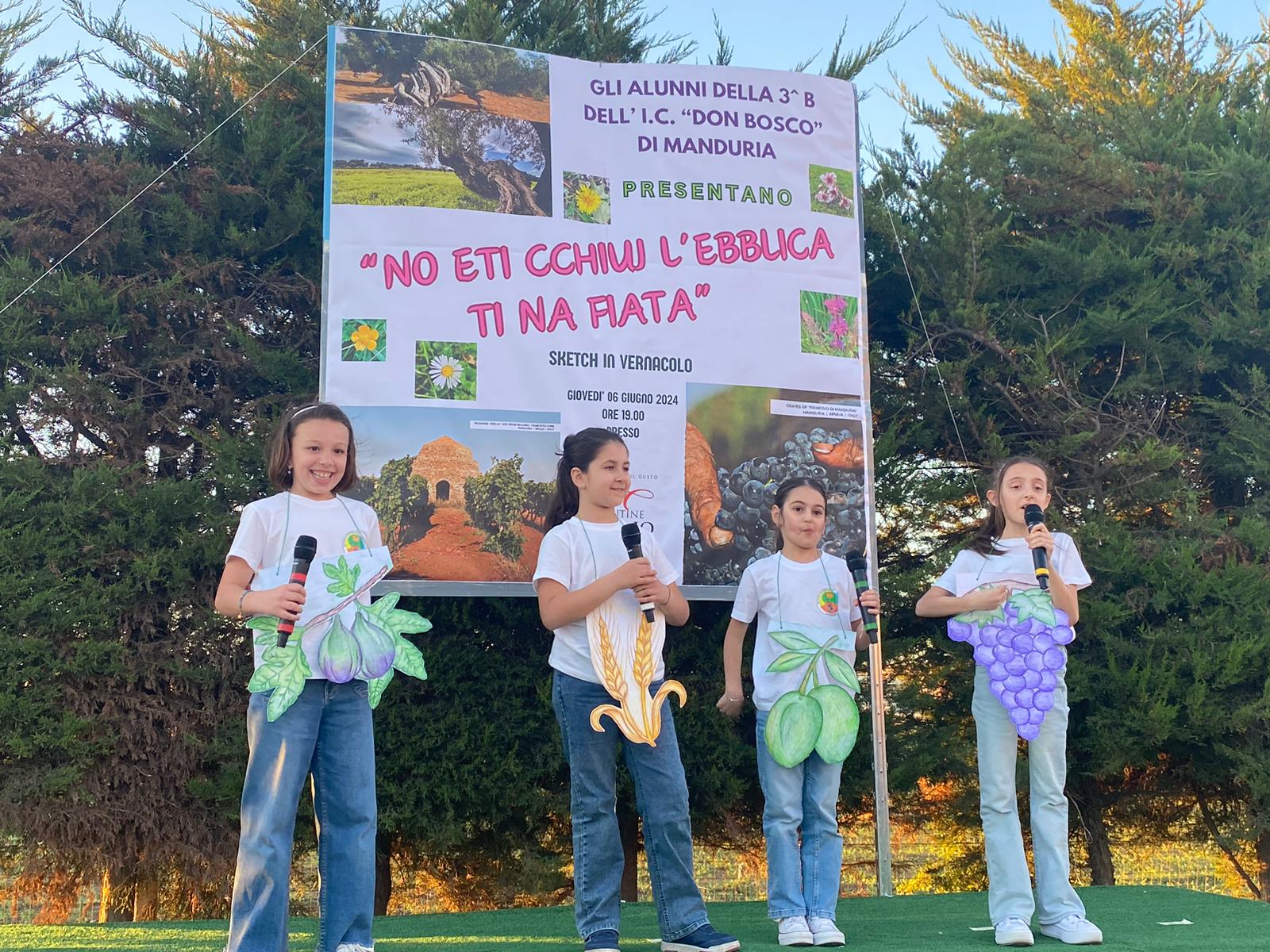 Nei giorni scorsi gli alunni della classe 3ª B della scuola primaria dell’I. C. “Don Bosco” hanno salutato la fine dell’anno scolastico alla loro maniera: con una bella recita, momento di socializzazione di un percorso laboratoriale che li ha visti impegnati sia sul valore del nostro dialetto che sulla riscoperta e salvaguardia dei prodotti locali.