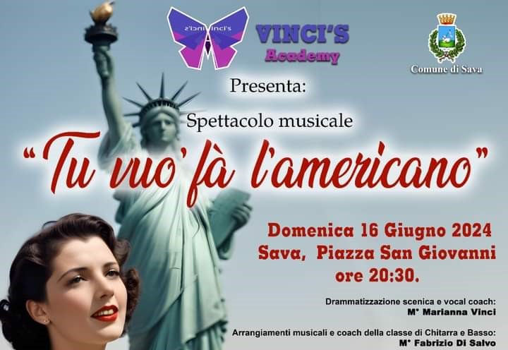 E’ questa la trama dello spettacolo musicale “Tu vuò fa l’americano” che la Vinci’s Academy proporrà domenica 16 giugno, alle 20,30, in piazza San Giovanni.