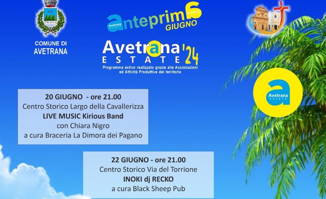 Da oggi i primi eventi del cartellone estivo avetranese: sono promosse dall’Amministrazione, insieme alle attività commerciali, all’Unità Pastorale e alle associazioni locali. La prossima settimana verrà reso pubblico il calendario completo relativo ai mesi di luglio, agosto e settembre. A renderlo noto l’assessore al ramo Emanuele Micelli.