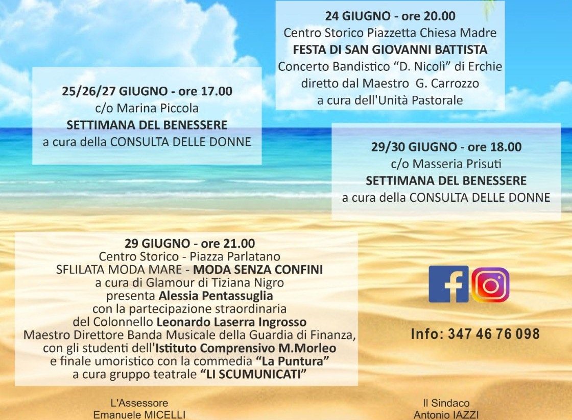 29 giugno - Ore 21, centro storico, piazza Parlatano, sfilata di moda mare “Moda senza confini”; presenta Alessia Pentassuglia con la partecipazione straordinaria del Colonnello Leonardo Laserra Ingrosso, maestro direttore della banda Mmusicale della Guardia di Finanza, con gli studenti dell’istituto comprensivo “M. Morleo” e finale umoristico con la commedia “La Puntura” a cura gruppo teatrale “Li Scumunicati”