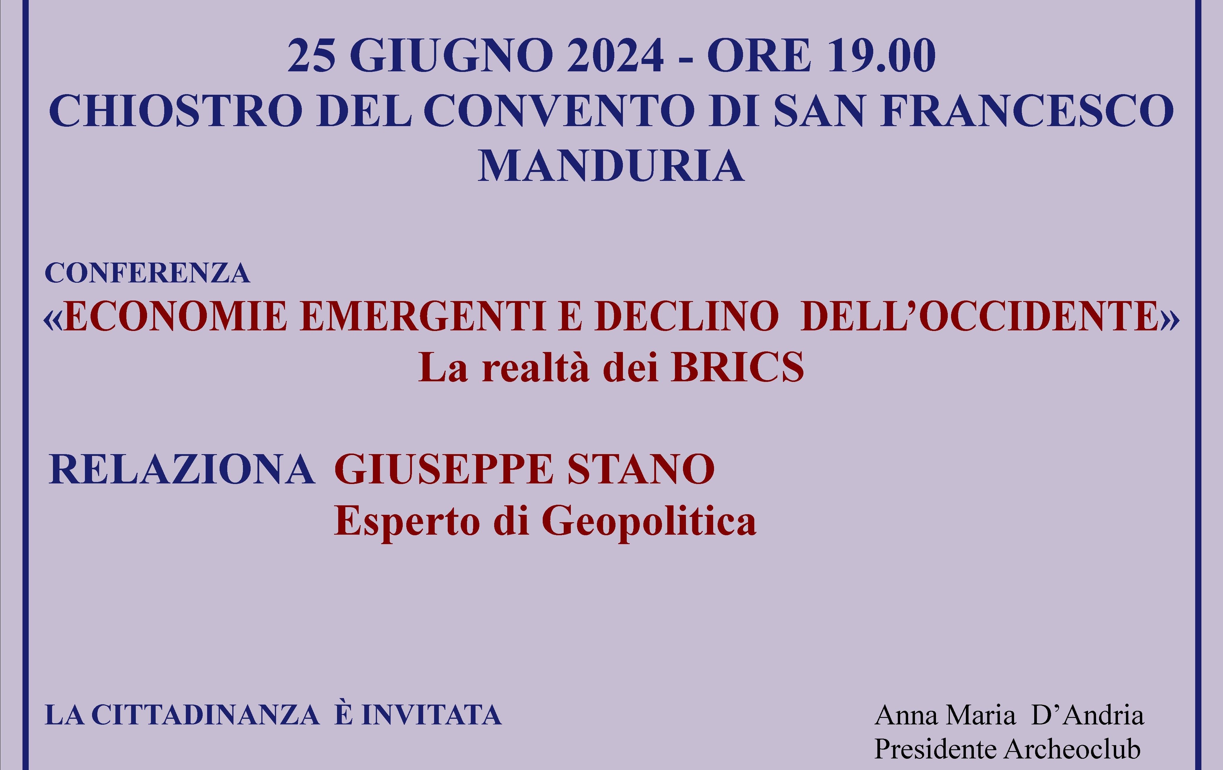 Questa volta la relazione, ancora una volta tenuta dall’esperto di geopolitica Giuseppe Stano, sarà incentrata sul tema “Economie emergenti e declino dell’Occidente. La realtà dei BRICS”.