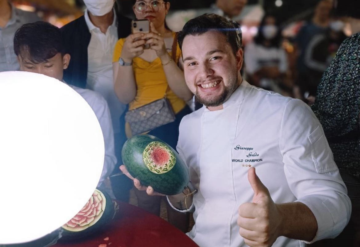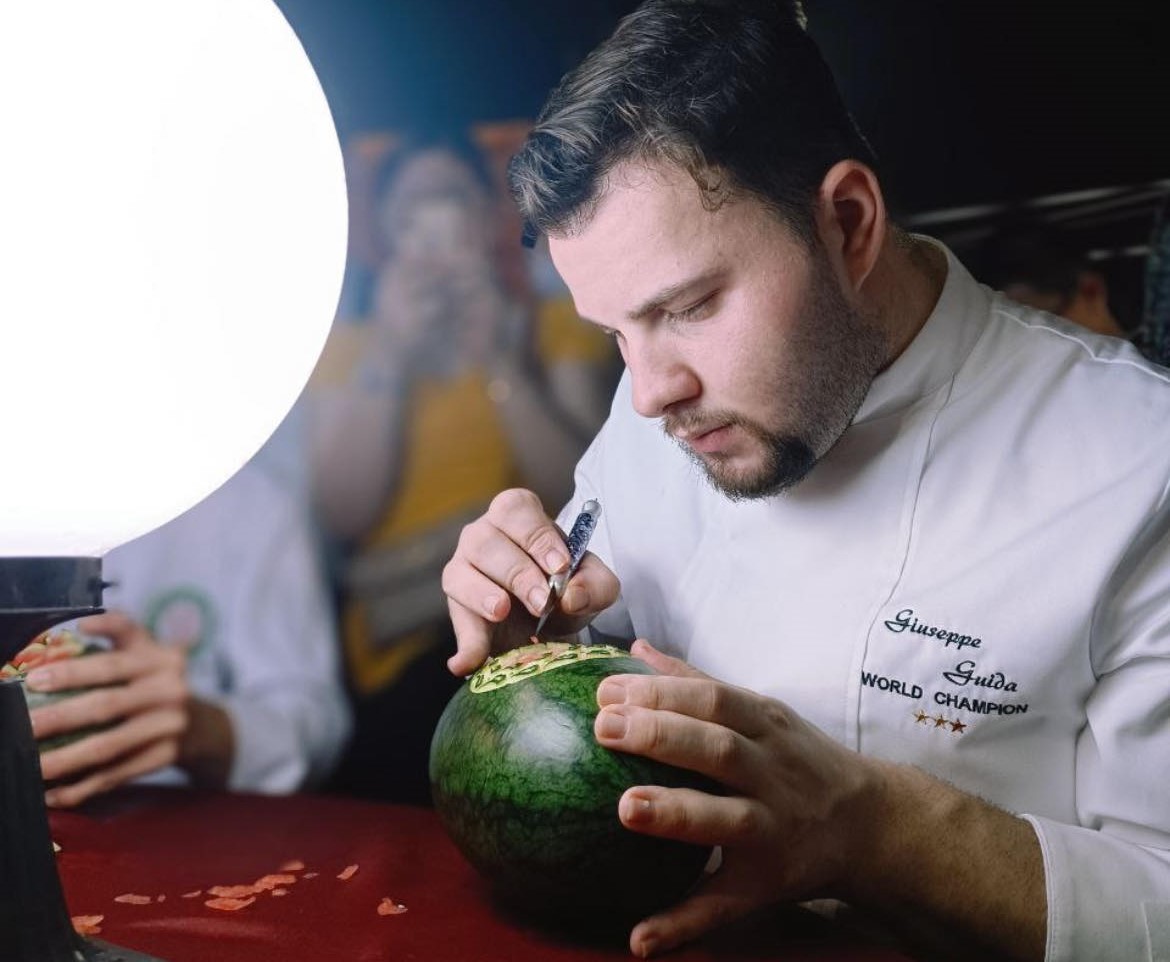 Dopo aver vinto due titoli di campione del mondo al Culinary World Cup di Lussemburgo e dopo la recente esperienza in Vietnam per uno stage presso l’illustra maestro Phamhoang Pham, ancora una meritatissima vetrina d’eccezione per Giuseppe Guida, un’eccellenza nell’arte dell’intaglio thailandese di frutta e ortaggi.