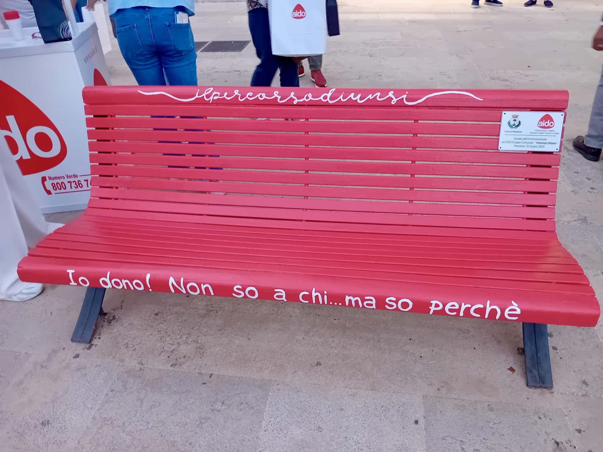Sulla panchina rossa il messaggio universale che l’opera vuole veicolare: “Io dono non so per chi, ma so perché”