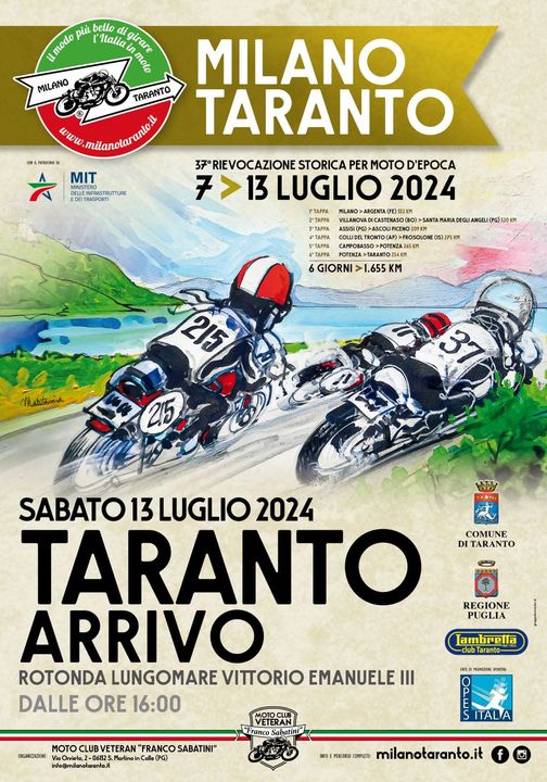 Sabato 13 luglio, dalle ore 16, giungerà a Taranto la “Milano - Taranto”, che taglierà il traguardo sul lungomare Vittorio Emanuele III, di fronte alla Rotonda dove, subito dopo le oltre 150 moto storiche e alcune meno “anziane”, saranno allineate per mostrarsi al pubblico.