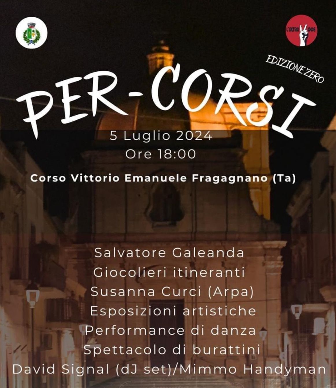 Conto alla rovescia per l’edizione zero di “Per-corsi”, l’evento culturale promosso dall’Amministrazione comunale di Fragagnano in collaborazione con l’associazione di promozione sociale “L’Altravoce” che da anni si impegna nel sociale per promuovere e diffondere la cultura musicale, arti visive, cinematografia, laboratori inclusivi e tanto altro.