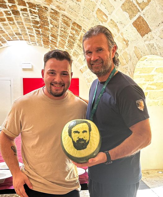 Presso masseria Li Reni, il campione del mondo Giuseppe Guida ha potuto dimostrare il proprio talento realizzando il ritratto del famoso chef su un’anguria e ricevendo i complimenti di Carlo Cracco.