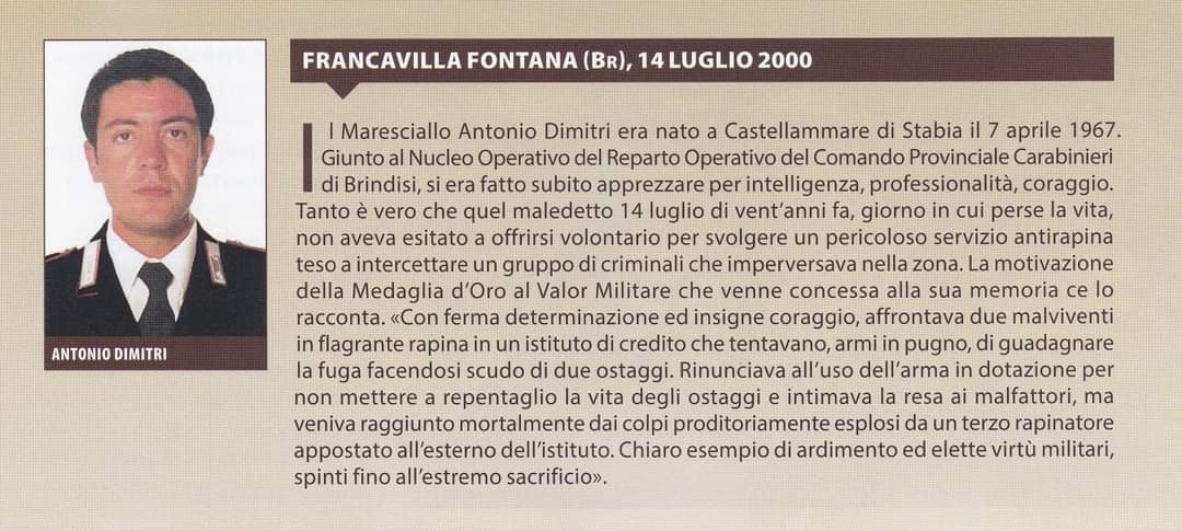 Sabato 13 luglio l’Associazione Nazionale Sottufficiali d’Italia, sezione di Manduria, onora e ricorda come ogni anno la Medaglia d'Oro del maresciallo ordinario carabiniere Antonio Dimitri, l’eroe manduriano e servitore dello Stato caduto in servizio nel tentativo di fermare una rapina nella città di Francavilla Fontana.
