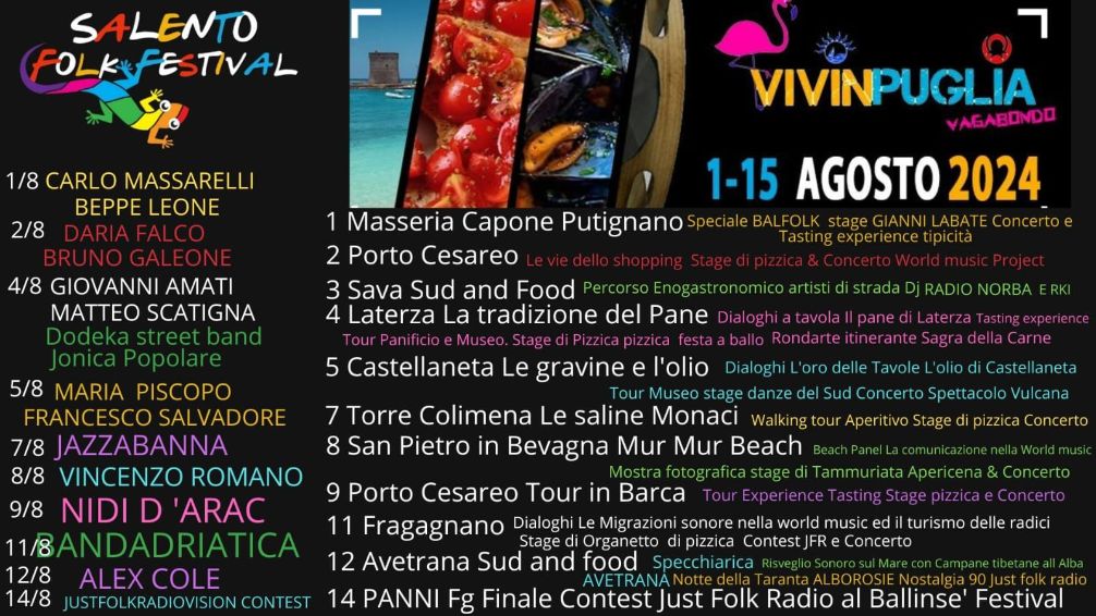 Si avrà anche l’opportunità di immergersi nelle tradizioni, nei canti e nelle musiche del Mediterraneo e della world music: si potrà ascoltare durante i workshop e il Salento Folk Festival, nato parallelo al Vivinpuglia per far conoscere le band di musica popolare e world music. Il Vivinpuglia Vagabondo 2024 includerà dialoghi, incontri, novità e un interessantissimo beach panel dedicato all'importanza della comunicazione nelle canzoni, riportando l'attenzione al turismo delle radici.