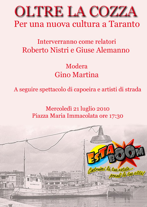 ridotto la cultura tarantina a qualcosa di miserabile. Essa ha risposto alla crisi del movimento operaio, del modello fordista, della stessa cultura industriale incarnata dalla grande fabbrica con una profonda regressione. Abbiamo avuto tanti bei simboli altisonanti (la Taranto spartana, la narrazione del “Miracolo” dopo la crisi, ma anche il culto superficiale di miti e riti, l’esaltazione del corpo mistico dei tifosi), che hanno raso al suolo qualsiasi visione dialettica e conflittuale del corpo sociale cittadino. E' venuta consolidandosi l’immagine di una Taranto con la maiuscola: una comunità coesa, isola rispetto al resto del mondo: quasi una nuova polis culturalmente omogenea e autosufficiente. Un’idea di grandezza che serviva forse più a coprire la profonda mediocrità e rapacità dei componenti delle classi dirigenti cittadine.Oggi, nonostante quella strategia politica sia fallita, la visione culturale che la animava è ancora viva e vegeta. La nostra città ha saputo esprimere potenzialità di tutto rispetto. Nei campi dell’arte e della scienza si sono registrati negli ultimi anni importantissimi risultati da parte di nostri concittadini (si pensi alla narrativa). Tuttavia molti di questi hanno trovato terreno fertile per le proprie capacità solo lontano da Taranto. Il contesto culturale di questa città resta infatti caratterizzato da un circolo vizioso: i giovani con maggiore sensibilità culturale continuano ad emigrare perché il territorio non è in grado di valorizzarli; d’altra parte, opportunità in questo senso stentano ad emergere proprio perché la domanda di cultura segue i sentieri che i “fuori sede” intraprendono per realizzare le proprie aspettative. Ciò condanna Taranto ad un profondo degrado.