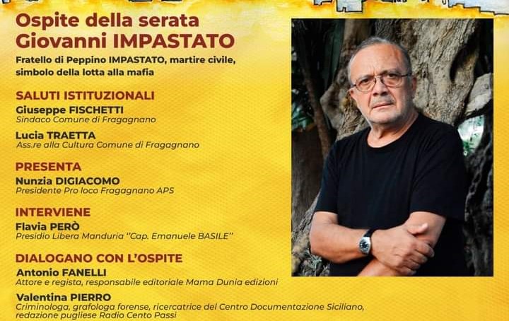 Domenica 28 luglio il festival ospiterà Giovanni Impastato, fratello di Peppino Impastato, martire civile e simbolo della lotta alla mafia. Coordinerà i lavori Nunzia Digiacomo, presidente Pro Loco Fragagnano. Dialogheranno con l’ospite Antonio Fanelli, attore e regista, responsabile editoriale Mama Dunia edizioni e Valentina Pierro, criminologa, grafologa forense, ricercatrice del Centro Documentazione Siciliano, redazione pugliese Radio Cento Passi. Interverrà Flavia Però in rappresentanza del presidio Libera Manduria “Cap.Emanuele Basile”.