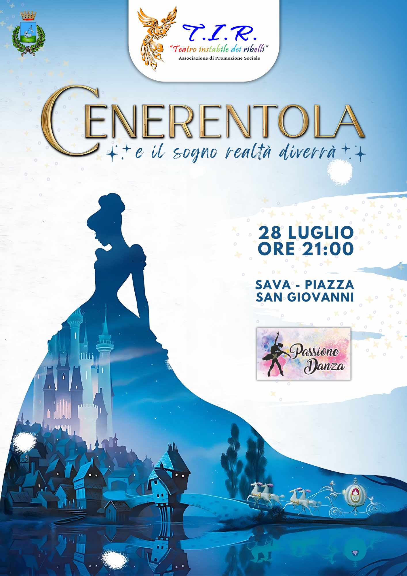 Il gruppo T.I.R. - Teatro Instabile dei Ribelli porta in scena questa favola arricchita dal ritmo e dalla spettacolarità della commedia musicale. Cenerentola, La Fata, la Matrigna, le Sorellastre, il Principe, sono personaggi che hanno affascinato generazioni, dai sogni infantili alle pagine dei libri, fino alle riletture cinematografiche di Walt Disney.
