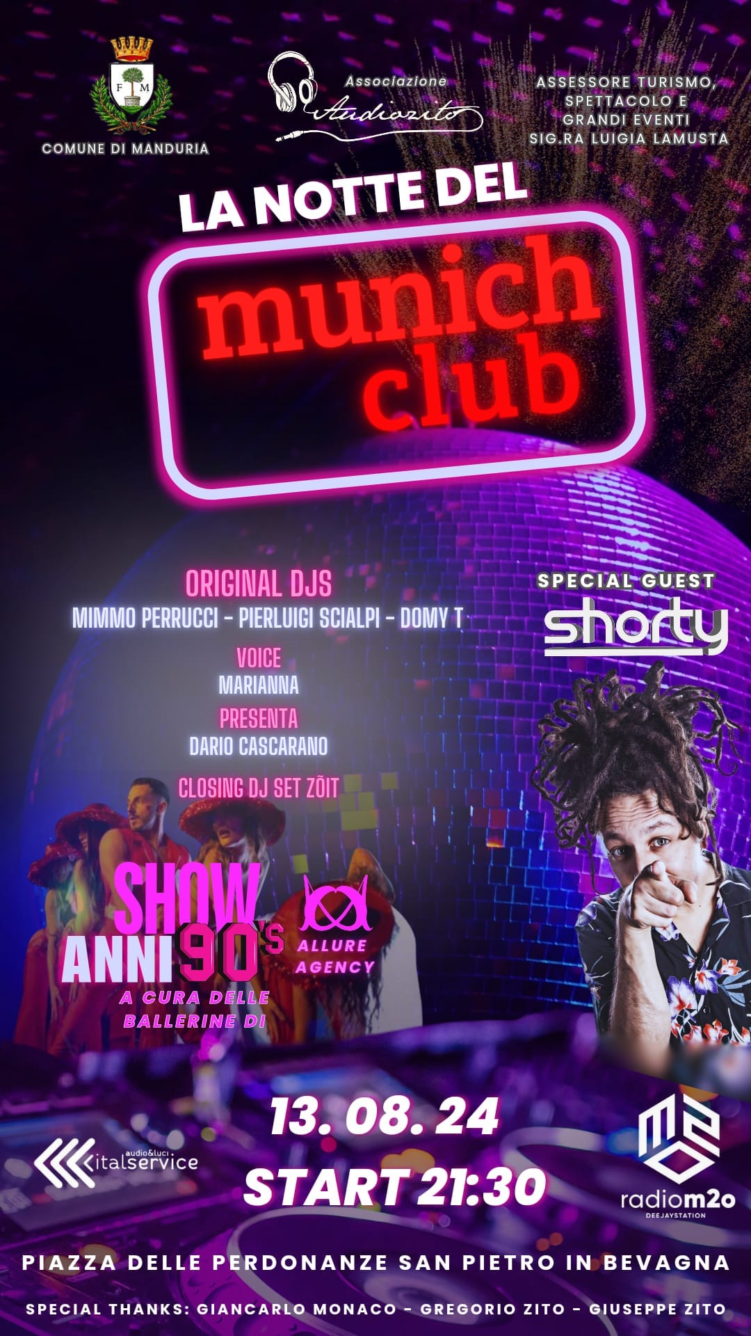 Il 13 agosto, in piazza delle Perdonanze, ritorna l’attesissima Notte del Munich Club. A promuoverla l’associazione Audio Zito in collaborazione con il Comune di Manduria e, più nello specifico, con l’assessorato al Turismo, Spettacolo e Grandi Eventi.
