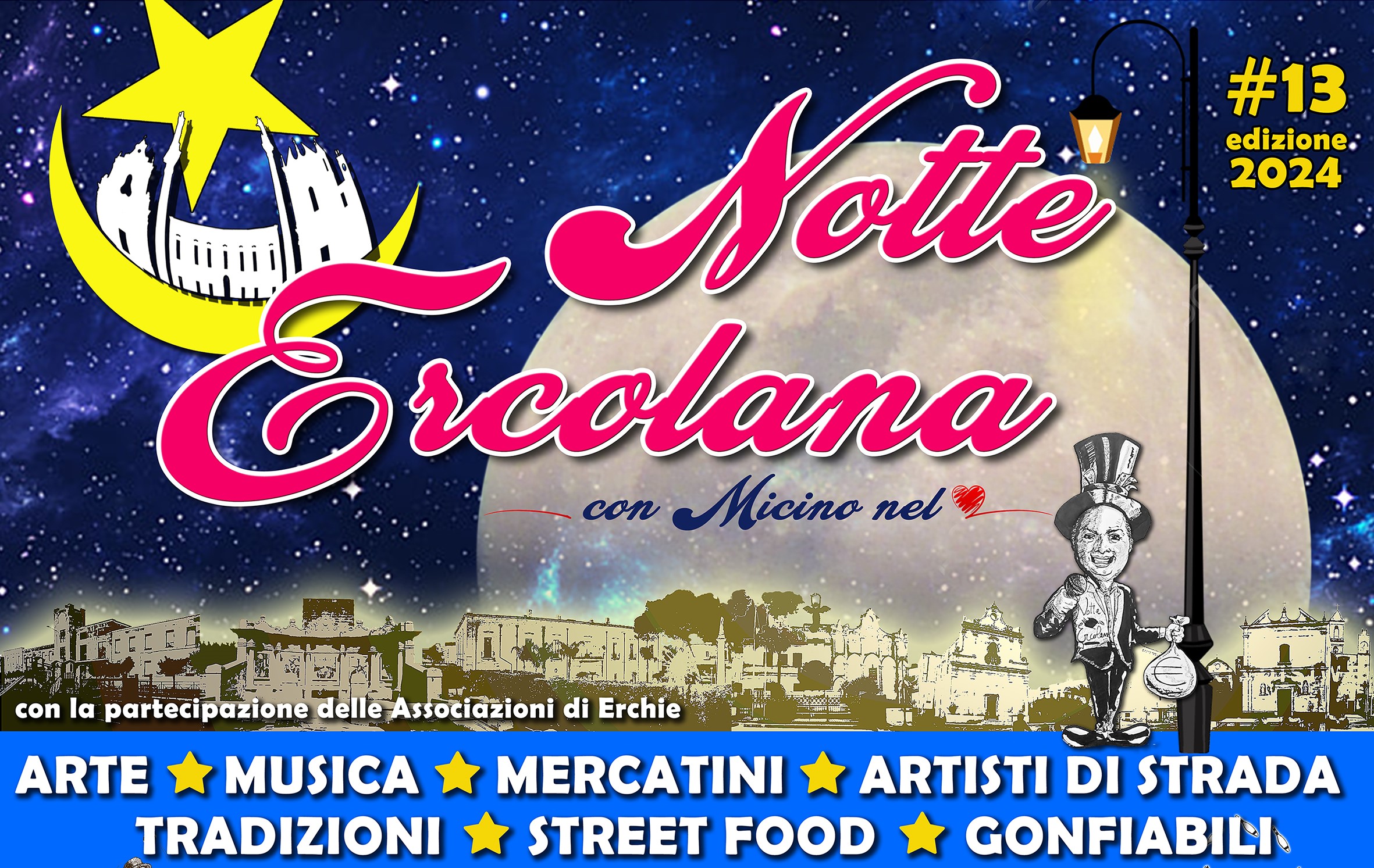 Con lo scopo di valorizzare e recuperare le tradizioni del paese, ritorna sabato 3 agosto ad Erchie “La Notte Ercolana”. Eventi musicali, festival degli artisti di strada, street food, mercatini, spettacoli, mostre, spazio per i più piccoli, tutto questo nel centro storico ercolano. Questa iniziativa nasce dalla collaborazione tra Pro Loco Erchie, il Comune di Erchie, le attività commerciali e le associazioni locali. La serata sarà accompagnata dalla musica, che, in estate, sembra avvolgere e abbracciare tutto e tutti.