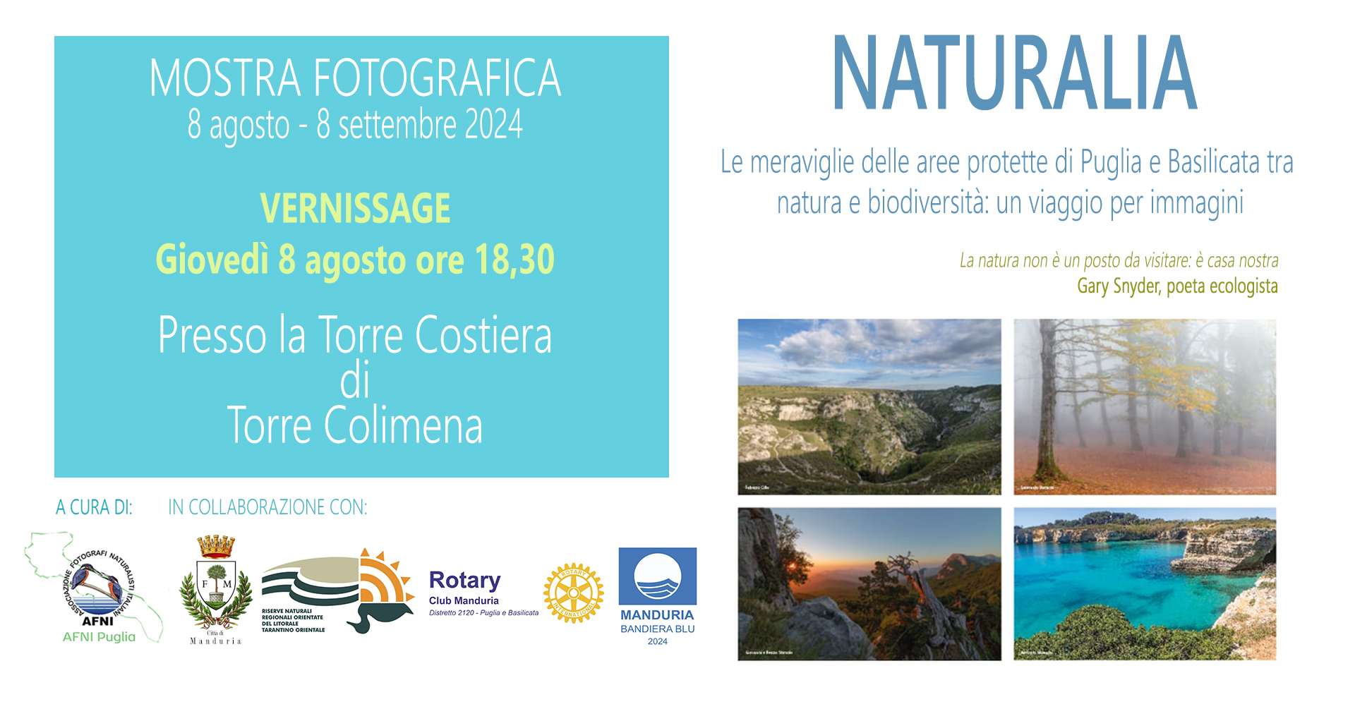 Nella rassegna fotografica “Naturalia” la grazia e l’incanto di presenze discrete e schive che frequentano i parchi della Puglia e della Basilicata diventano bellezza godibile da tutti grazie alla passione per la natura del proprio territorio di diciotto fotografi, soci AFNI - Associazione Fotografi Naturalisti Italiani. Per loro, documentare le meraviglie degli ambienti naturali e svelarne la biodiversità, operando nel più assoluto e incondizionato rispetto di ogni forma di vita, è un’emozionante missione.