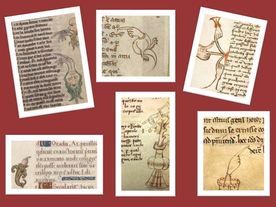 Icona di creatività medievale, la “manicula” è un originale segno grafico posto a margine della pagina di un libro, raffigurante una piccola mano chiusa, con il solo indice teso a indicare un passo del testo che, per un motivo qualsiasi, il lettore (o il copista oppure, talvolta, l’autore stesso) vuole mettere in evidenza. Facente parte dei “marginalia figurati” (vere e proprie note figurate con cui i lettori medievali glossavano il testo, da piccoli segni di attenzione a veri e propri disegni marginali), la “manicula” si immerge nello spazio bianco lasciato dall’autore, dando vita a uno speciale fuori testo nel quale «si realizza la reazione osmotica del lettore alle parole dell’autore con cui può intimamente dialogare» (Cfr. Giulia Fasano in https://revistas.usal.es/dos/index.php/1576-7787/article/download/18444/18682).