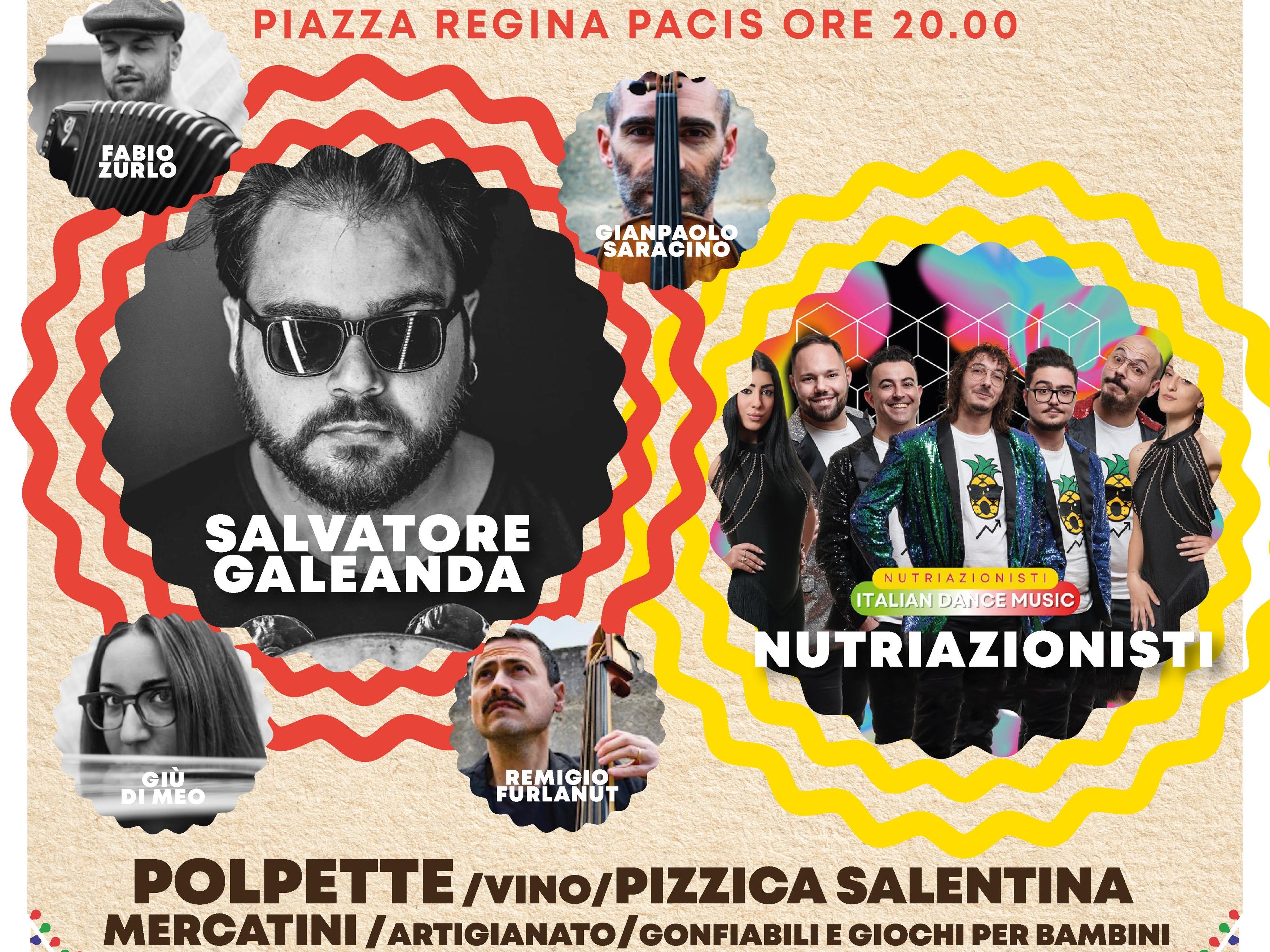 Saranno proposte le deliziose polpette tradizionali, accompagnate da vino locale e la coinvolgente pizzica salentina. La serata sarà animata da un ricco programma musicale con artisti d’eccezione: con la pizzica salentina di Salvatore Galeanda, famoso artista e protagonista del concertone della Notte della Taranta, e poi divertimento assicurato con la bellissima musica anni ’80 e ‘90 cantata e ballata dai Nutriazionisti che con uno spettacolo coinvolgente faranno ballare tutta la piazza.