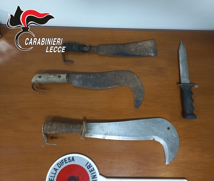 Immediatamente sottoposti a perquisizione personale e domiciliare, i coniugi sono stati trovati in possesso di 3 roncole ed un pugnale. Il tutto è stato sottoposto a sequestro.
