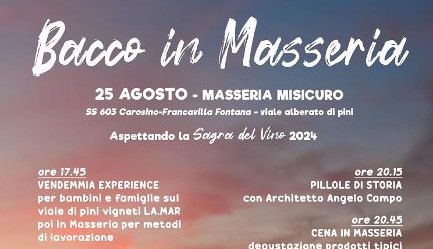 Il prossimo appuntamento è “Bacco in Masseria” che si terrà, a partire dalle ore 17.45, nella serata di domani (domenica 25 agosto), un evento con posti limitati (info e prenotazioni 377.3286860) che costituisce un gustoso prologo alla “Sagra del Vino 2024”.