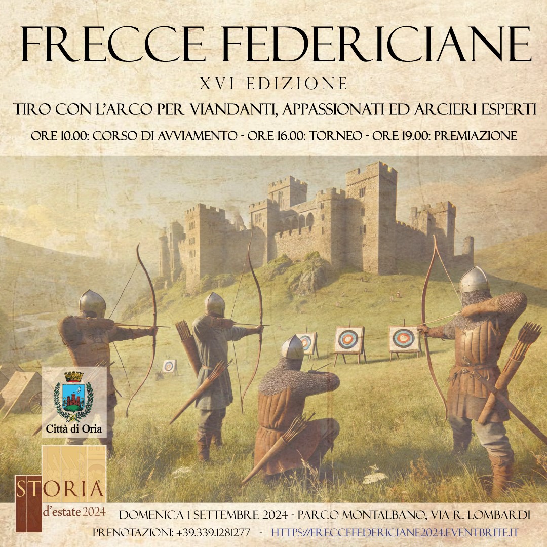 La città di Oria si prepara a ospitare un evento imperdibile che unirà passione, storia e sport in un'unica giornata indimenticabile. Domenica 1 settembre, nella splendida cornice del parco Montalbano, prenderà vita la XVI edizione di “Frecce Federiciane”, una manifestazione che trasporterà i partecipanti nel cuore del Medioevo, tra sfide di tiro con l'arco passione per la storia.