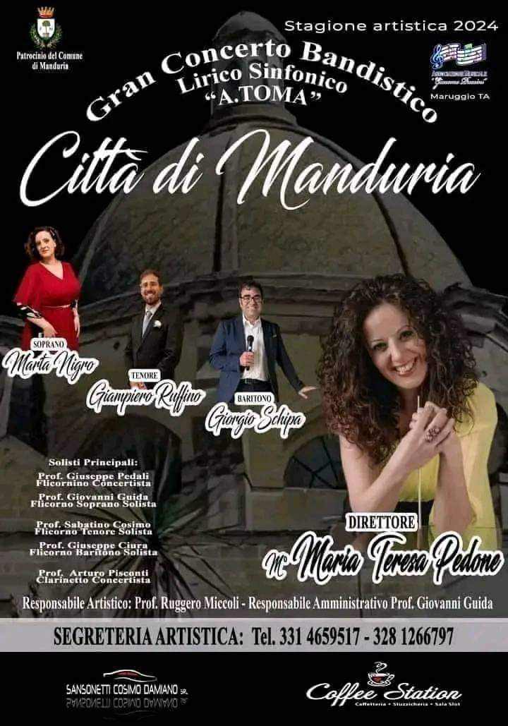 Il Gran Concerto Bandistico lirico sinfonico A. Toma Città di Manduria si esibirà questa sera in piazza.