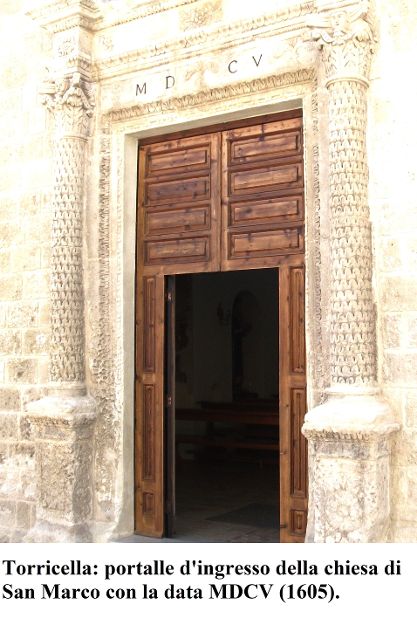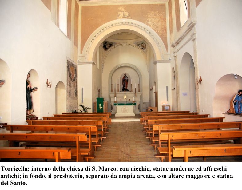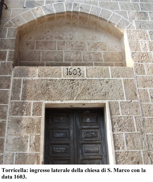 Una descrizione di questa chiesa si trova in documenti del Seicento, che confermano la dedica al Santo Evangelista, indicando, a destra dell’entrata, il fonte battesimale, poi l’altare dedicato a S. Marco, poi la cappella con il quadro della Madonna del Rosario. Si segnala, inoltre, l’altare di Maria Immacolata e, a sinistra della navata centrale, la cappella della Madonna di Giustizia, affrescata sulla parete. Trattasi di una composizione interna oggi poco riconoscibile, modificatasi, ovviamente, nel corso dei secoli. Si ritrovano, comunque, in tali descrizioni seicentesche, alcuni elementi strutturali principali, quali il presbiterio, in fondo alla navata, separato da ampia arcata, con altare maggiore ed accesso alla sacrestia; si aggiunge il campanile “sul quale si sale con una scala di fabbrica”, con due campane (vedi M. SPINOSA, Ricognizione storico documentaria dei feudi della famiglia Muscettola principi di Leporano. Pulsano*, Leporano*, Monacizzo*, Torricella, Taranto, Scorpione, 2003, pp. 311, 391-394).