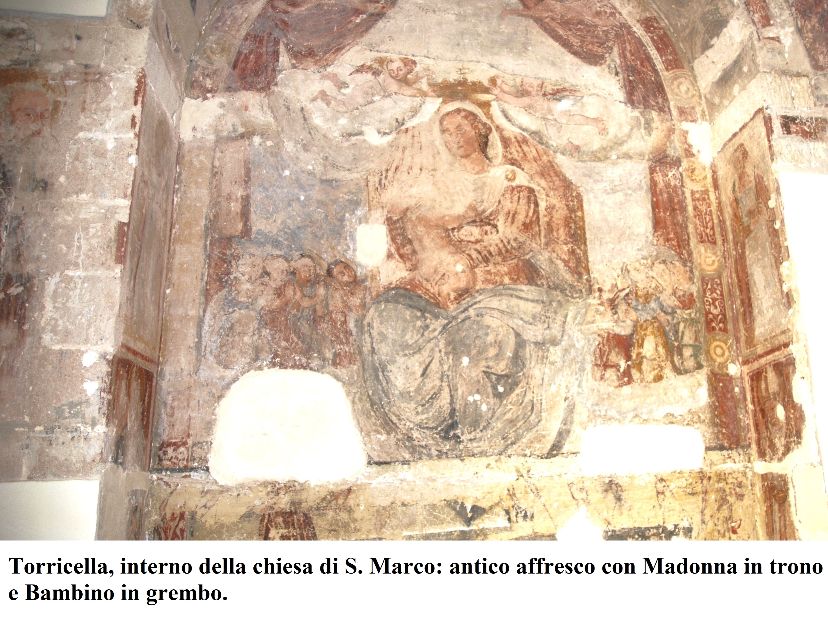 Tornando alla chiesa di S. Marco, sempre sulla parete di sinistra si osservano, in sequenza, due nicchie con statue in cartapesta di San Cosimo e San Damiano, la porta dell’accesso secondario ed un grande affresco (tra questa porta e l’ ampia arcata di separazione del presbiterio dalla navata) recante l’ immagine della Madonna tra le nuvole, con Bambino in grembo, e, alla base, due figure discretamente conservate, una di nobildonna, l’altra di probabile canonico, con abbigliamento costituito da abito nero ed ampie bende bianche nel colletto, piuttosto diffuso tra il XVII e XVIII secolo (vedi L. Boyle, Il sacerdote ben vestito, sito Internet (Google) del 13.1.2014; vedi abito e colletti simili, definiti di foggia settecentesca, in un affresco da Ceglie Messapica, abbazia di S. Anna, edito in G. SCATIGNA MINGHETTI, Il “percorso mariano” a Ceglie Messapica, in A.M. DE LOS REYES, a cura di, La via di Maria … cit. pp. 77-79).