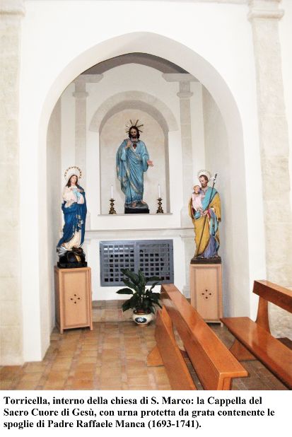 Statue recenti in cartapesta ed affreschi antichi caratterizzano anche la parete opposta. Qui, infatti, a destra dell’ingresso, si apre un’ampia nicchia, attualmente occupata dalla statua di S. Antonio. La parete di fondo rivela resti di affreschi poco comprensibili, altri, molto deteriorati, si pongono sulle pareti esterne, laterali, con un vescovo effigiato sulla parete di destra (per chi guarda) ed un Francescano su quella di sinistra. Segue una nicchia con statue della natività, poi una profonda cappella, con statua del Cristo (Sacro cuore di Gesù) posta, in alto, al di sopra di un altare alla cui base si osserva uno spazio interno protetto da grata contenente l’urna con le spoglie di Padre Raffaele Manca, morto in odore di santità nel 1741 “al cui sarcofago in legno veniva applicato nel 1902 un frontespizio fisso in vetro, decorato con motivi floreali” (vedi G. IZZINOSA, Torricella per P. Raffaele Manca S. nel 250° anniversario della morte, in “lu Lampiune”, VI (1991) n. 3, pp. 377-385); M. PICHIERRI - P. FRANZOSO, Torricella da Borgata a Comune, Manduria, Barbieri, 1999, p. 145); a lato di questo altare si collocano le statue di S. Giuseppe e della Madonna con, ai piedi della Vergine, i simboli della falce lunare e del serpente, tipici dell’ Immacolata Concezione. Segue una piccola nicchia, posta in alto, occupata dalla statua di Gesù Cristo “Buon Pastore”.