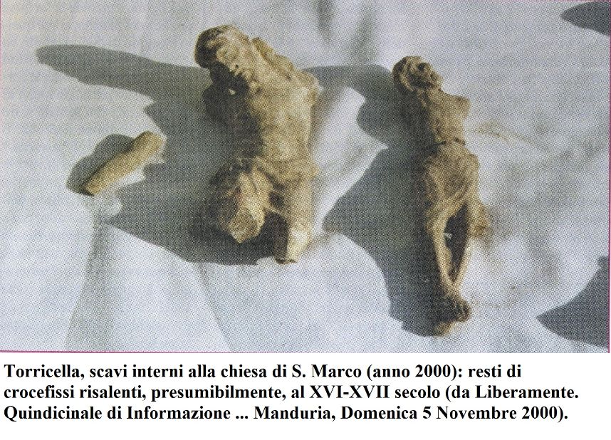 Tutto ciò evidenzia modifiche succedutesi nel corso del tempo, con vari spostamenti anche nella collocazione delle statue. Sull’ampia arcata che separa il presbiterio dalla navata si osservano i resti di pitture oramai sbiadite (possibili stemmi ecclesiastici o nobiliari) recanti la data 1959. Interventi di restauro risalenti al 1987 avrebbero portato alla luce alcuni affreschi sulle pareti interne di destra e sinistra. Alquanto interessanti appaiono, infine, i risultati di recenti scavi operati all’interno della chiesa (anno 2000), che sotto il pavimento hanno evidenziato, oltre alla presenza di numerosi ossari e statuette di creta raffiguranti Cristi in croce (datati, presumibilmente, al XVI-XVII secolo) resti di “materiali che facevano parte dell’antica volta che copriva questa chiesa”; da alcuni saggi effettuati sotto intonaco alla muratura è stato altresì possibile “dare una lettura di alcuni ambienti e/o elementi architettonici, tompagnati in lavori precedenti. Sono poi venuti alla luce altri scorci di affreschi e nuovi contorni affrescati” che si aggiungono agli affreschi evidenziati dal COCO e dai restauri del 1987 (da “Liberamente”, Quindicinale di Informazione, Attualità e Cultura, Manduria, 5 Novembre 2000 e 28 Gennaio 2001).