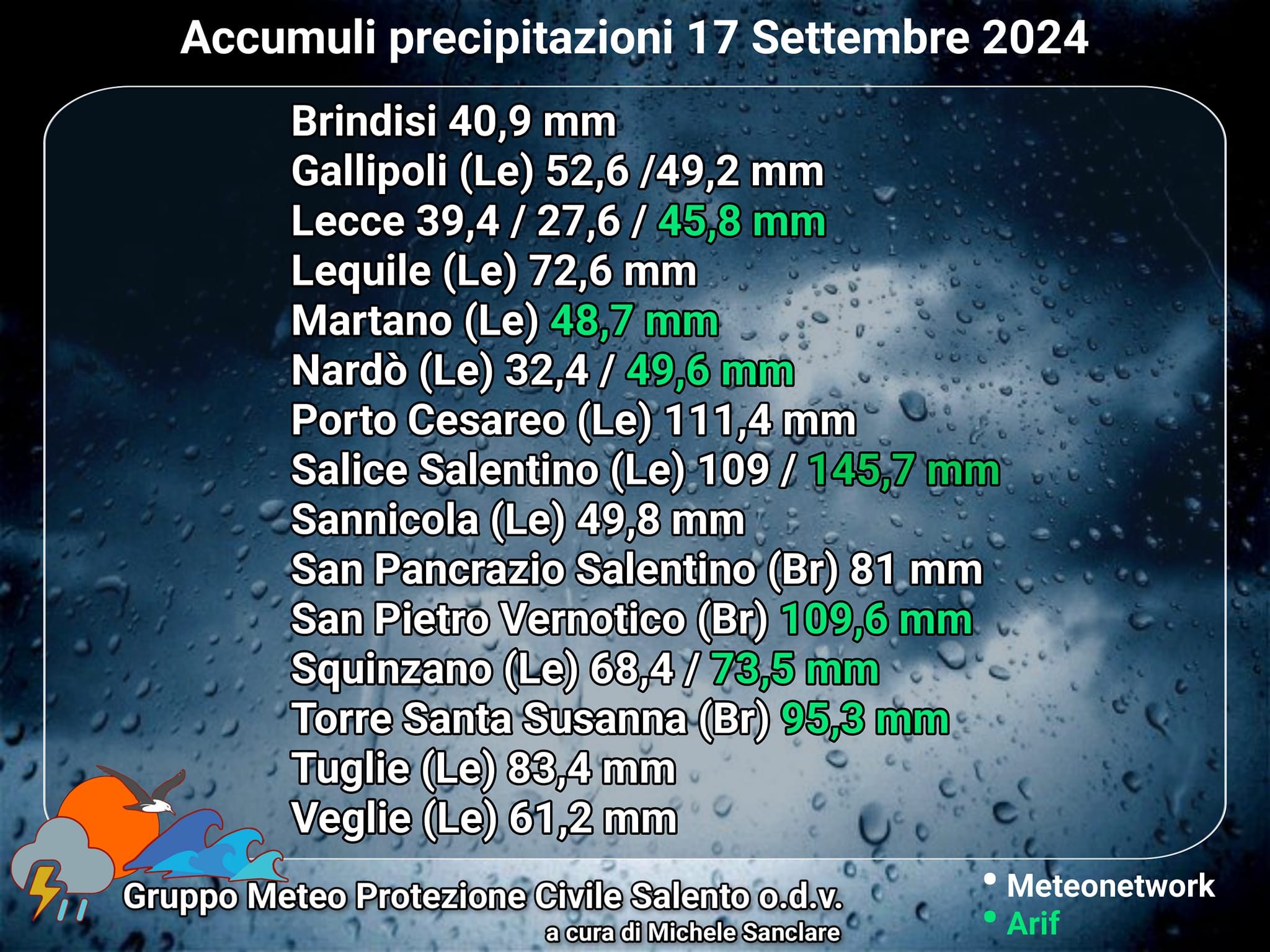 I dati diffusi dalla pagina Fb Gruppo Meteo Protezione Civile Salento ODV