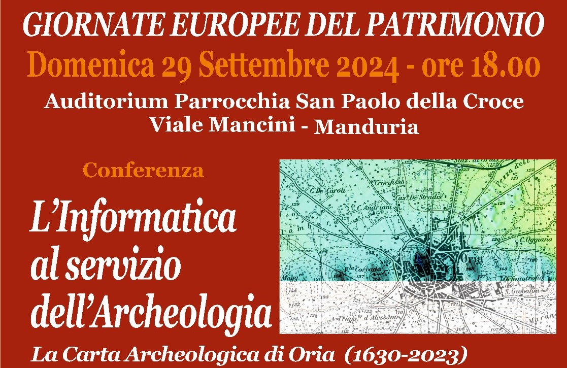 Domenica 29 settembre, alle ore 18, presso l’auditorium della parrocchia di San Paolo della Croce, la sede di Manduria di Archeoclub d’Italia, in occasione delle Giornate Europee del Patrimonio 2024, organizza un incontro culturale sul tema “L’informatica al servizio dell’Archeologia”.