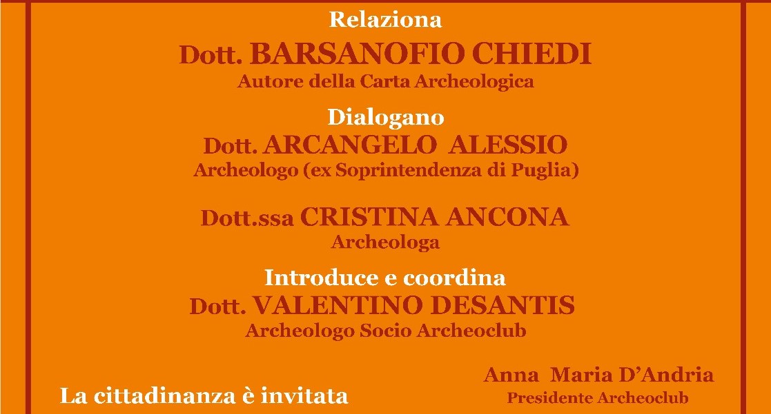Relaziona Barsanofio Chiedi, autore della carta Archeologica di Oria; partecipano al dibattito Arcangelo Alessio, archeologo, a lungo Soprintendente di Taranto e profondo conoscitore del nostro territorio e Cristina Ancona, archeologa.