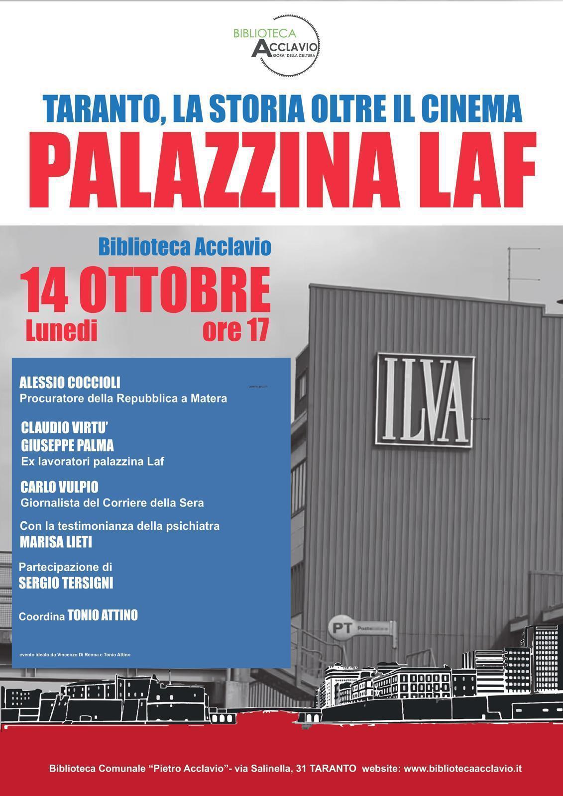La vicenda, che ha ispirato il film del regista tarantino Michele Riondino, verrà raccontata da alcuni dei protagonisti (reali) lunedì 14 ottobre nella sala Agorà della biblioteca civica Acclavio di Taranto. Taranto, la storia oltre il cinema. Palazzina Laf è un incontro (inizio ore 17) che ha l’obiettivo di andare alle origini della storia, ricostruendola grazie alle testimonianze di coloro che la vissero. L’incontro è aperto a tutti ma è nato avendo come pubblico ideale i giovani e gli studenti. Ci auguriamo possa essere un “esercizio” di educazione civica.