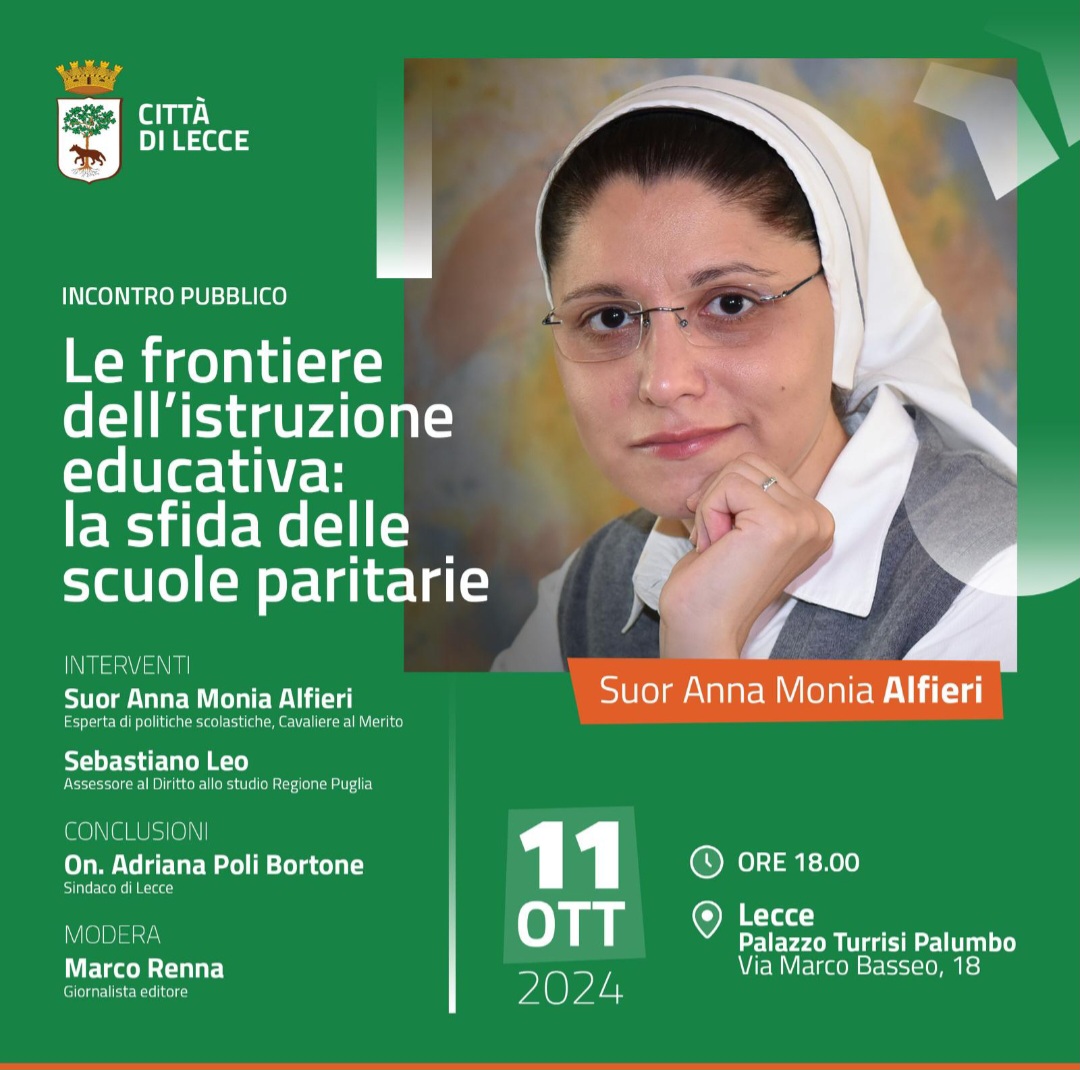 Suor Anna Monia Alfieri sarà a Lecce venerdì 11 ottobre in occasione dell’incontro «Le frontiere dell’istruzione educativa: la sfida delle scuole paritarie».