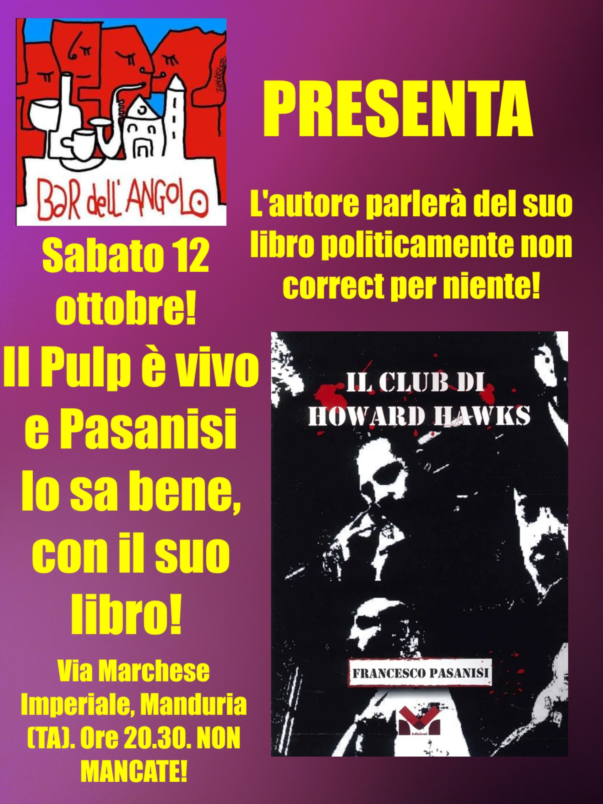 Sabato 12 ottobre, a Manduria, alle 20.30, il “Bar dell’Angolo” di Manduria ospiterà la presentazione del romanzo “Il Club Di Howard Hawks” dell’autore manduriano Francesco Pasanisi.