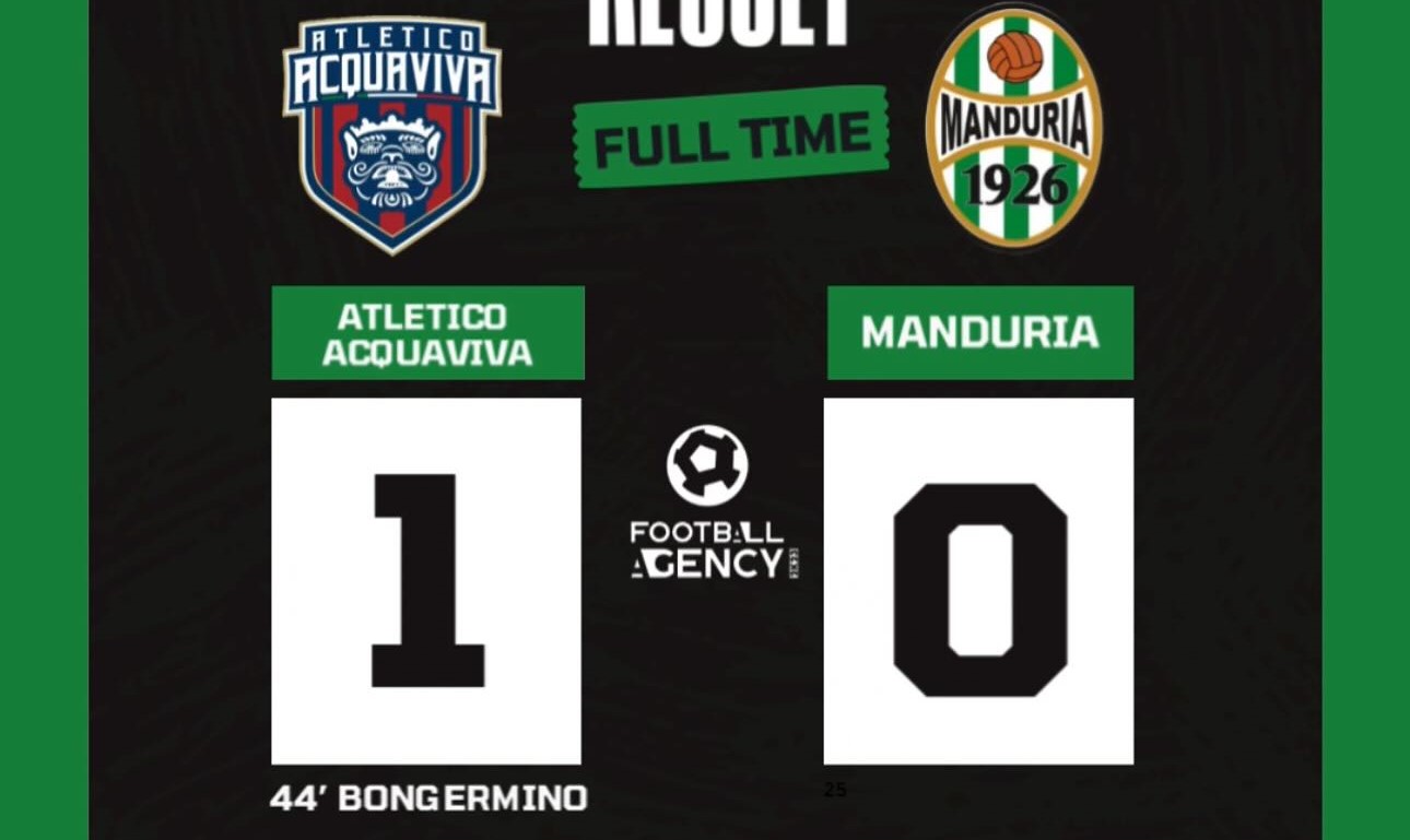 Il Manduria esce sconfitto di misura dallo stadio di Acquaviva ma francamente un pareggio sarebbe forse stato un risultato più equo che avrebbe premiato quanto meno l’impegno mostrato dai ragazzi biancoverdi. A segnare la vittoria per i padroni di casa, il goal realizzato da Bongermino al 44’ del primo tempo.