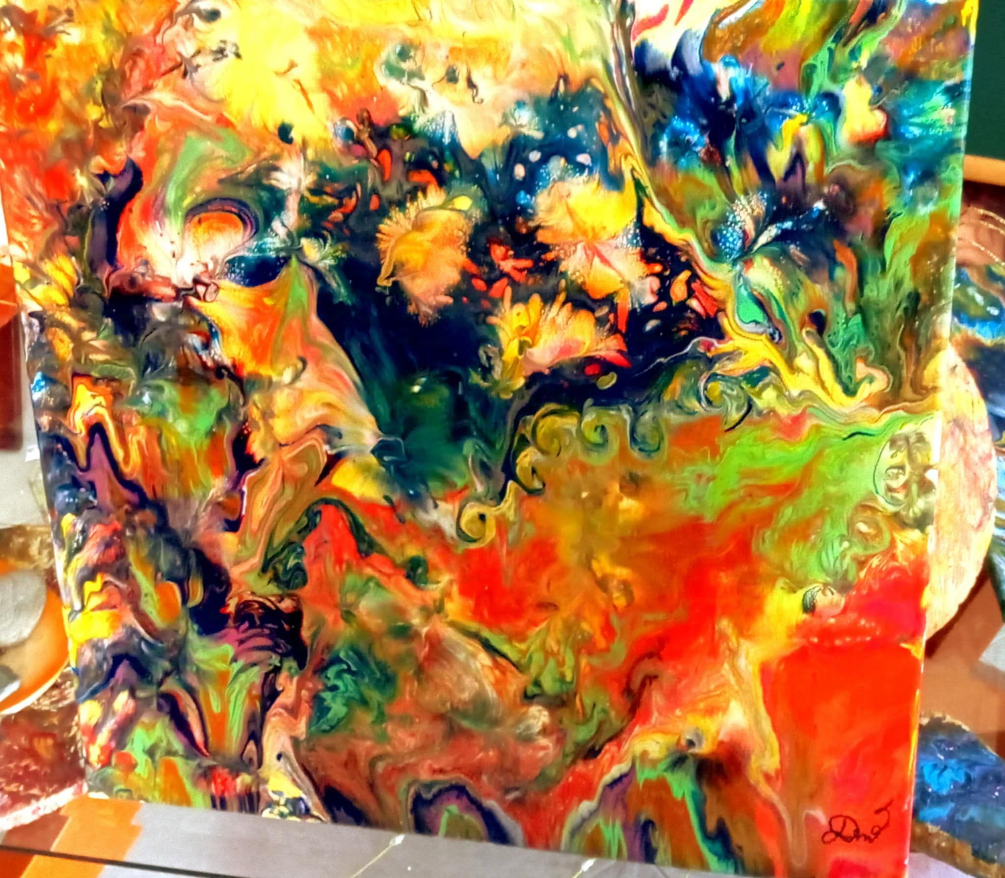 L’opera di Silvia Di Natale è denominata “Fuori dal tunnel” (è riprodotta nella foto)Si caratterizzata da colorazioni audaci, con pennellate ruvide, elementi che richiamano l’espressionismo. Vivaci colori a blocchi, che invitano lo spettatore ad interpretazione il messaggio della brava artista manduriana.