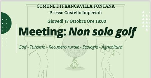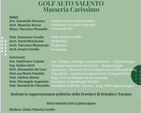 Si svolgerà giovedì prossimo, alle 18, nella cornice del castello Imperiali, sede del Comune di Francavilla Fontana, il meeting nel corso del quale verrà presentato il progetto inerente il Resort Golf Club “Alto Salento”, la cui collocazione logistica è prevista in contrada “Carlo Dinoi Superiore”, nel bosco di Betania, lungo la provinciale che conduce a Ceglie Messapica.