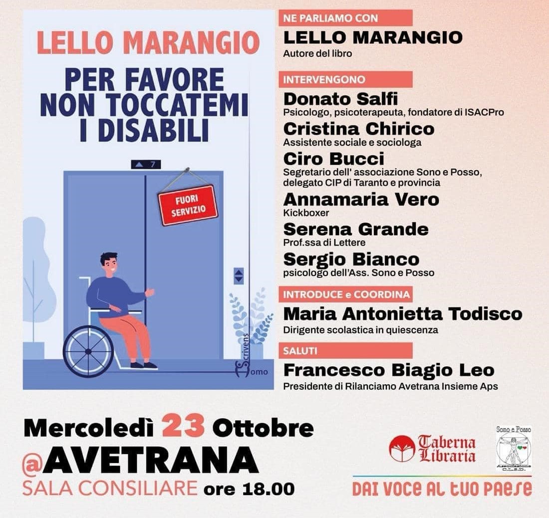 “Per favore non toccatemi i disabili”. E’ il titolo del libro di Lello Marangio, che sarà presentato mercoledì 23 ottobre, dalle ore 18, nella sala consiliare del Comune di Avetrana.