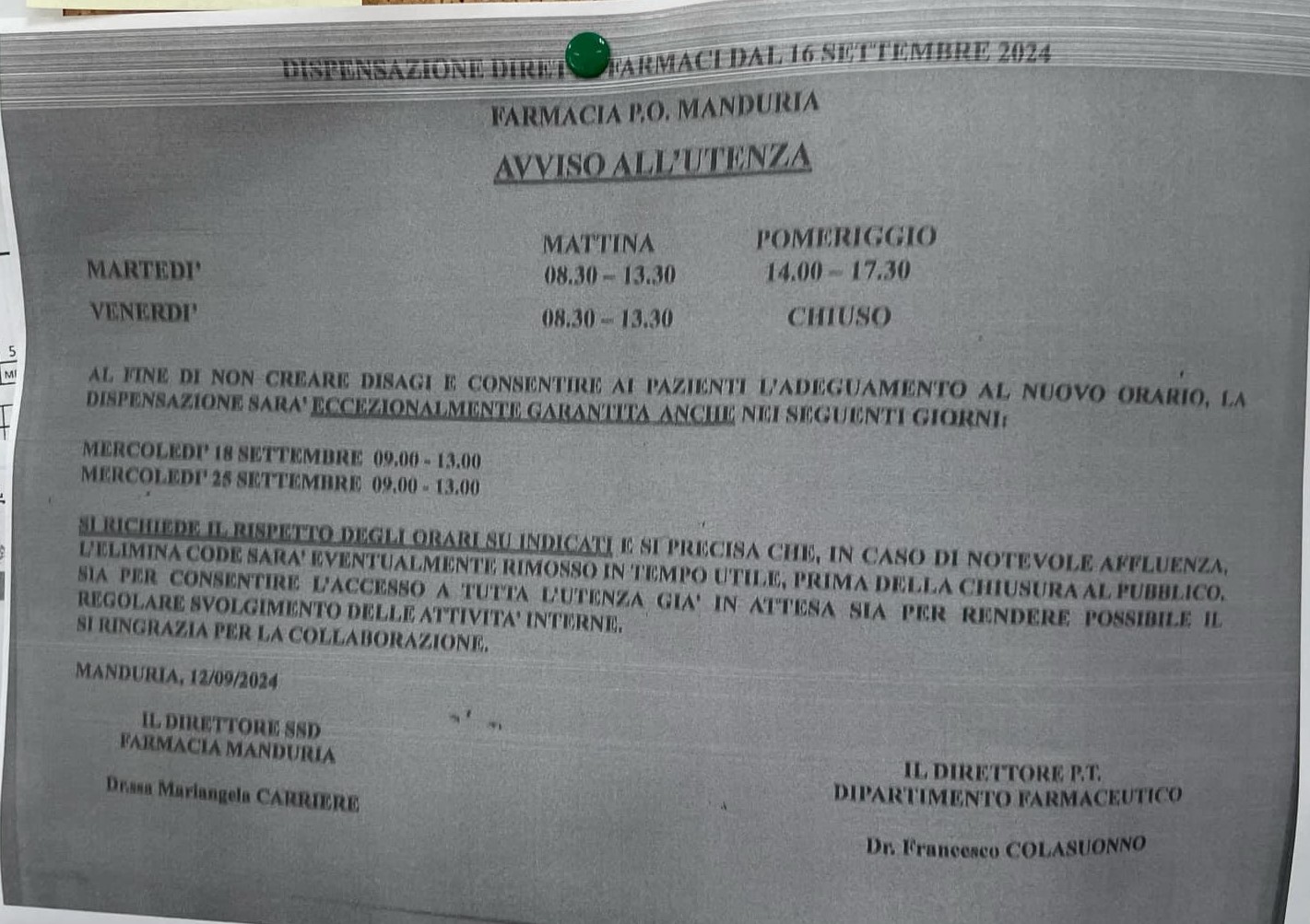 «Prima del segretario politico Demos, parla il libero cittadino, utente della farmacia ospedaliera come tanti altri cittadini di Manduria e dei paesi limitrofi. Un servizio pubblico che sino a qualche settimana fa era disponibile, nel mattino, per tre giorni a settimana e attualmente ridotto a due, nonché, nel pomeriggio, per due giorni a settimana e attualmente ridotto a due.