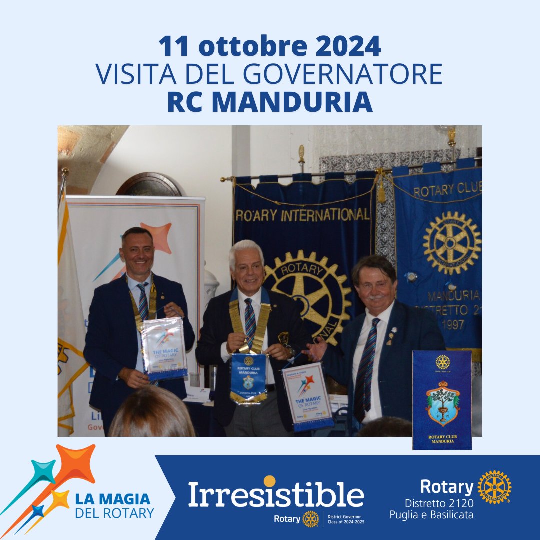 Lino Pignataro, governatore del Distretto 2120 Puglia-Basilicata del Rotary, è stato ospite, nei giorni scorsi, del Rotary Club di Manduria. Una giornata densa di emozioni, durante la quale sono state evidenziate le linee guida e gli importanti progetti del Distretto e, successivamente, il Rotary Club di Manduria ha presentato i numerosi service che saranno svolti nell’anno.